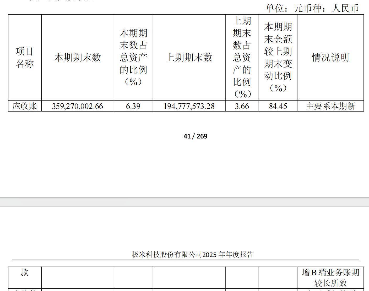 同样因为B端业务账期较长,极米科技的应收账款更是激增了84.45%,从2024年末的1.95亿元增长至2025年末的3.59亿元。