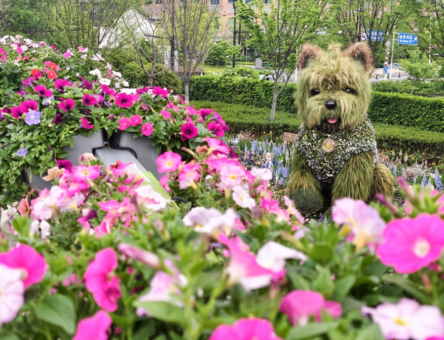 “毛茸茸的植物小狗”是静安分会场“花漾萌宠乐园”的核心景观。这座高5.2米、由数万株植物构成的“小狗”绿雕因其造型逼真且带有一种“潦草感”,近日在社交平台上刷屏。