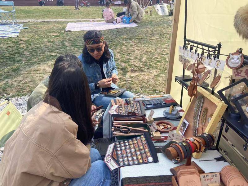 北青报记者现场了解到,活动现场打造潮流罐头市集,集结40余家特色文创摊主,产品涵盖原创潮品、自然生活好物、匠心手作、特色美食等丰富品类。市集摊主多为青年人,巧用原木、真皮、鲜切干花等天然材质精工细作,打造一件件别致精美的文创饰品,吸引众多亲子家庭驻足观赏、挑选选购,人气十分火爆。